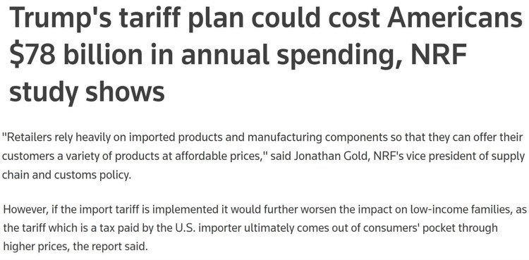 全美零售联合会(NRF)的一项研究指出,如果特朗普的新关税计划得以实施,美国消费者可能会因为物价上涨损失多达780亿美元的年度消费能力。
