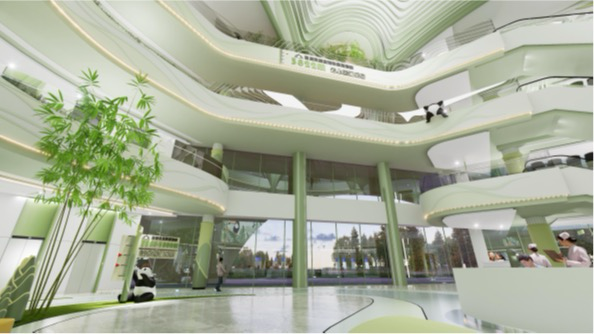 医院二期设计规划以“熊猫森林”为主题,憨态可掬的熊猫出现在主体建筑各个角落,立柱、护士站、标识牌、走廊将被“黑白萌兽”占领,它们与主体绿色完美融合,营造出具有川蜀特色、富有生机和童趣的医院空间。