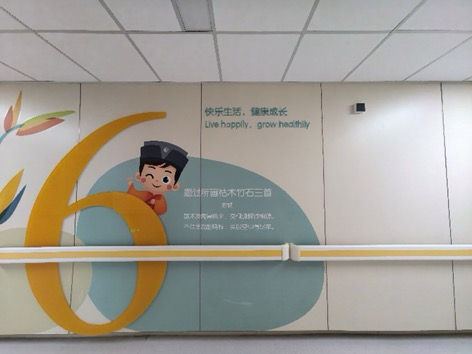 走进医院大楼,卡通风格的“小东坡”和“苏小妹”迎接小患者们,抬头仰望,顶部渐变蓝色的海洋设计带给人静谧、治愈的感觉,柔和的蓝色延伸点缀在空间开阔的大厅之中,安抚准备就诊的小患者。在门诊区和住院区,温馨治愈的米黄色墙壁、随处可见的动物卡通形象、色彩柔和的导引标识、橙黄色的全覆盖扶手、充满童趣的挂饰、柔黄色灯光的宽敞走廊、墙面上苏东坡的诗词……整个医院明亮舒适,公共区域安静、有趣,带给患者更好的就医体验,拉近他们与医院的心理距离。
