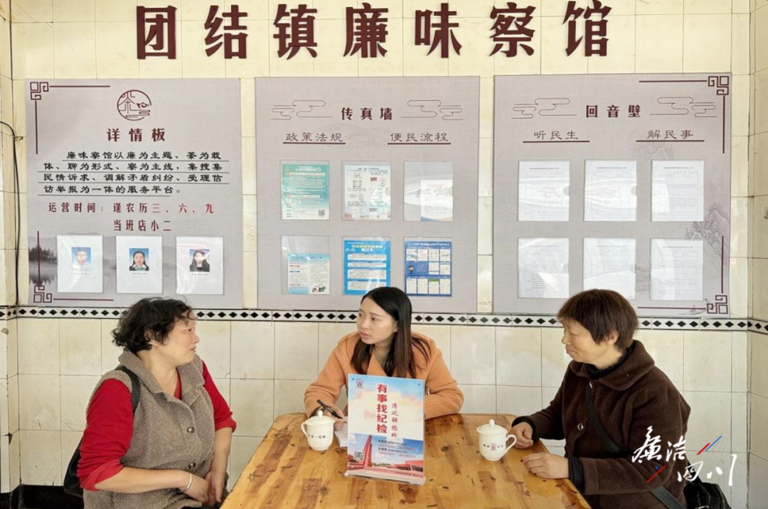 入冬后,天气逐渐转寒,自贡市大安区团结镇的“廉味察馆”却十分热闹。茶馆里,几张桌子坐满了人,每人一杯清茶,当天值班的镇纪委书记宋嘉怡正在热情接待群众,边招呼大家入座边收集问题诉求。