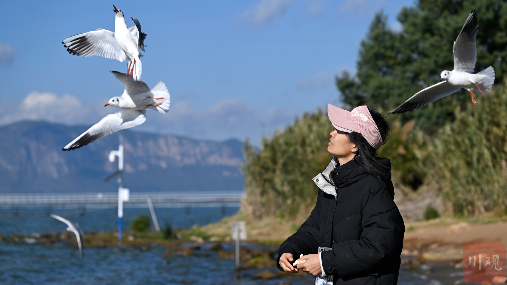王官社区志愿者张利云在滇池边投喂红嘴鸥。