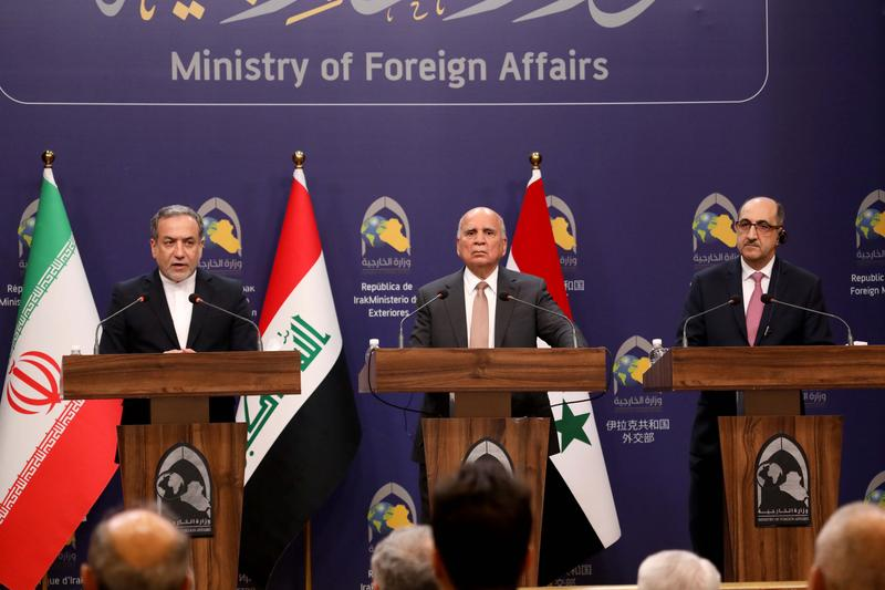 12月6日,在伊拉克巴格达,伊拉克外长侯赛因(中)、叙利亚外长萨巴格(右)和伊朗外长阿拉格齐出席联合记者会。新华社发(哈利勒·达伍德摄)