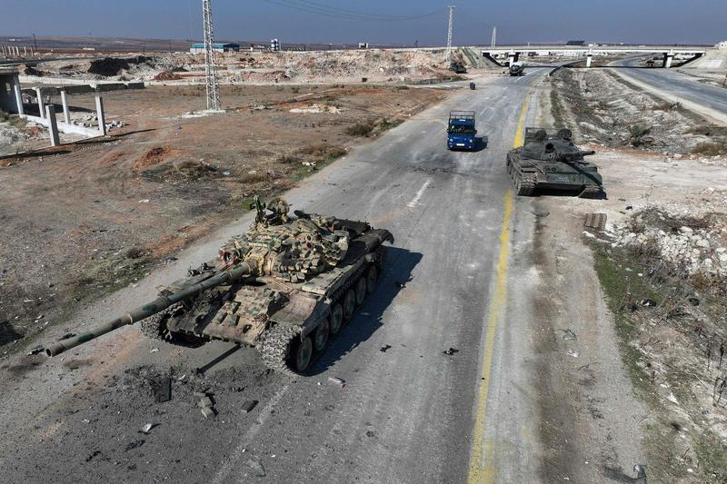 这是12月3日在叙利亚哈马省北部城镇苏兰附近拍摄的被叙利亚政府军遗弃的坦克(航拍照片)。 新华社/法新