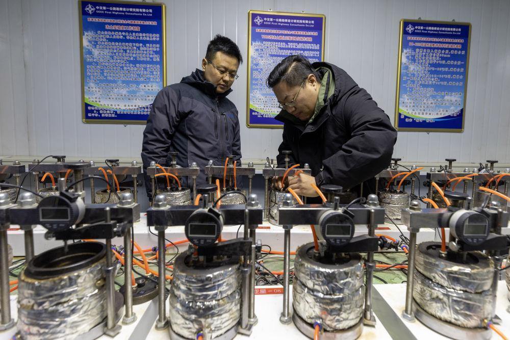 中交第一公路勘察设计研究院有限公司格尔木观测研究基地主任陈冬根(左)与同事在实验室里检查冻土样品(12月3日摄)。新华社记者 姜帆 摄