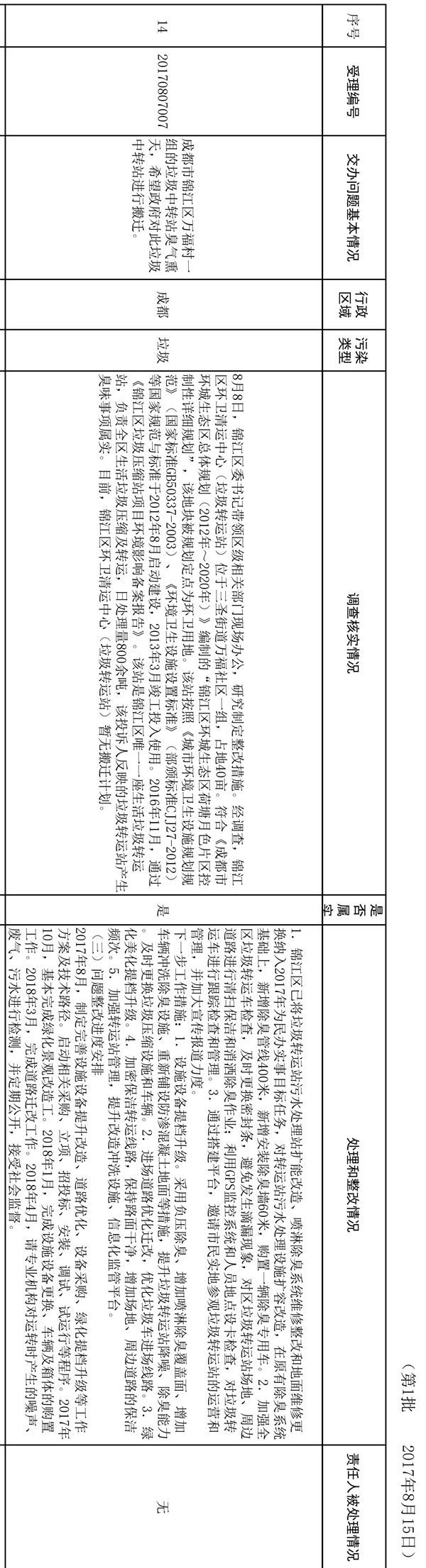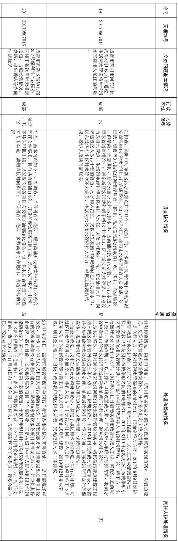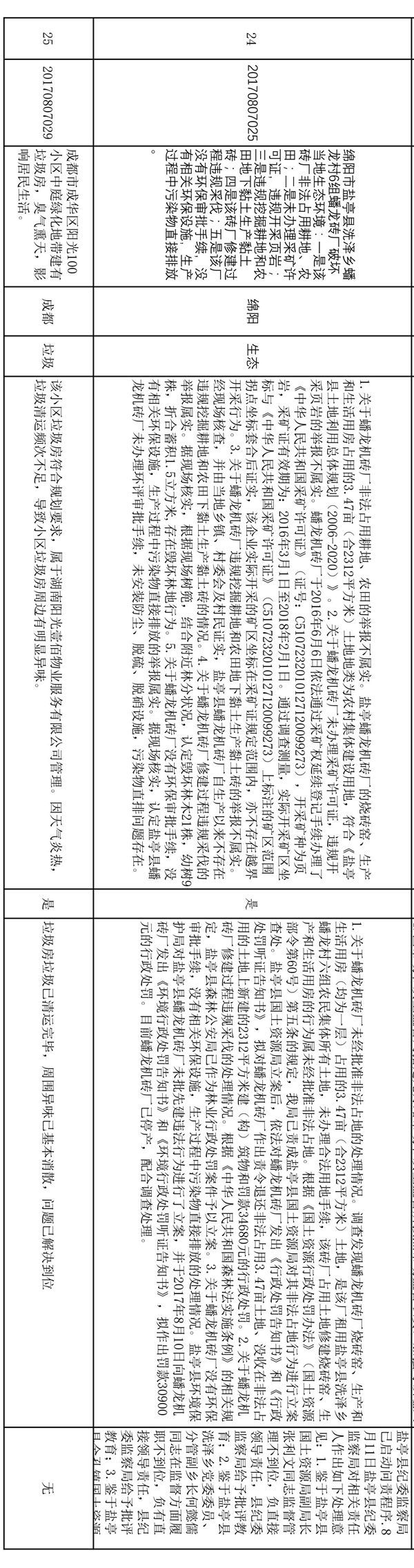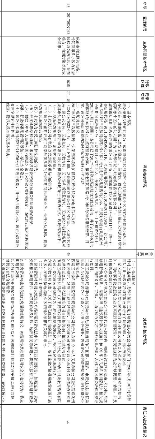 在问题整改中,我省强化问责追责,记者梳理发现,已办结的信访件中,有5件都对有关责任人进行了处理或按程序启动对相关责任人的调查追责。如有关绵阳市盐亭县蟠龙砖厂破坏当地生态环境的问题举报,盐亭县纪委监察局已启动问责程序,并对相关责任人进行了处理。