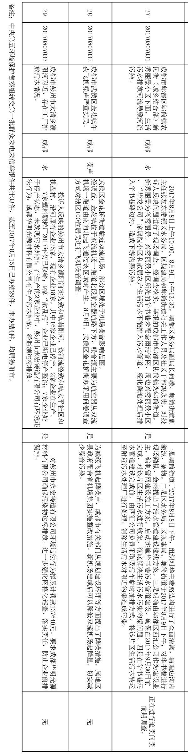 8月16日,记者从四川省迎接中央环境保护督察工作领导小组获悉,截至8月15日,中央第五环境保护督察组向四川转交的首批33件群众来电来信举报件已办结29件,其余4件正在办理中。