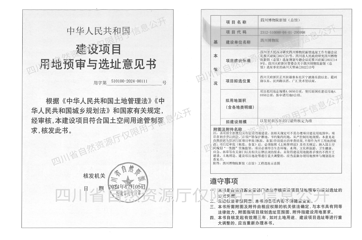 12月11日,记者从四川省自然资源厅官网获悉,四川博物院新馆(总馆)《建设项目用地预审与选址意见书》(以下简称《意见书》)公开发布。