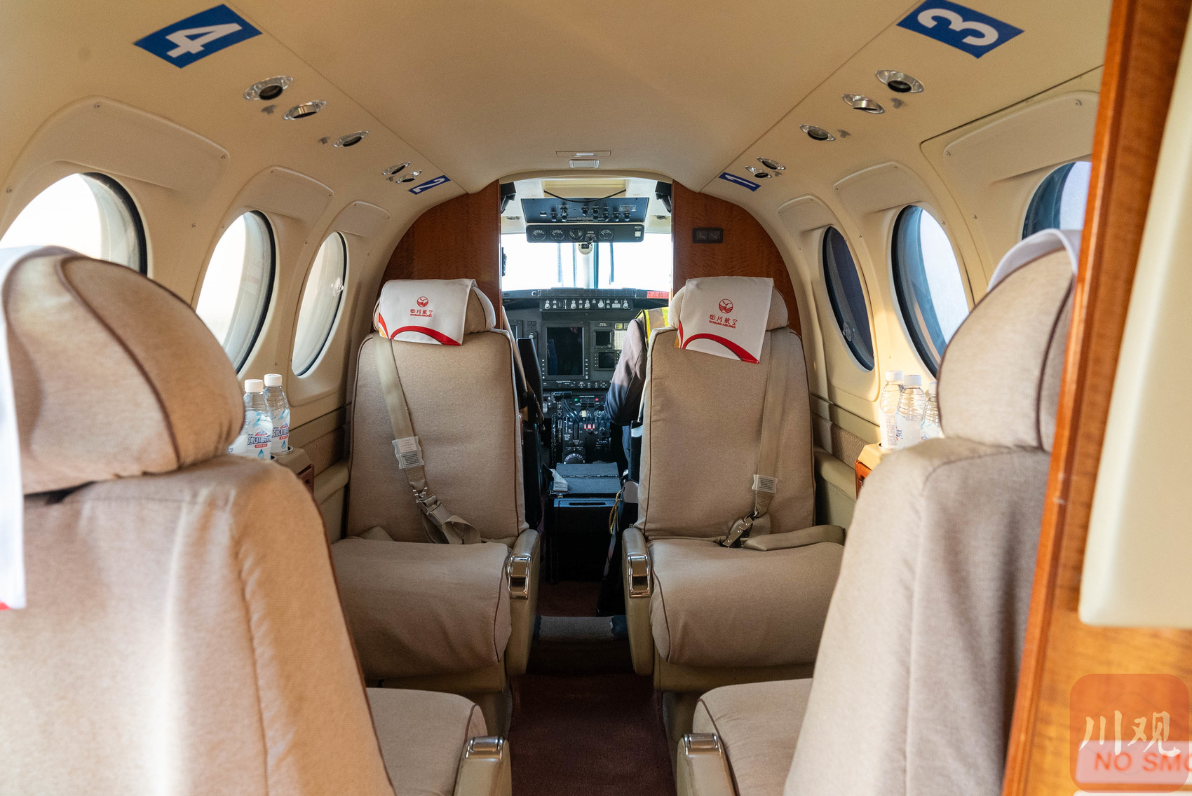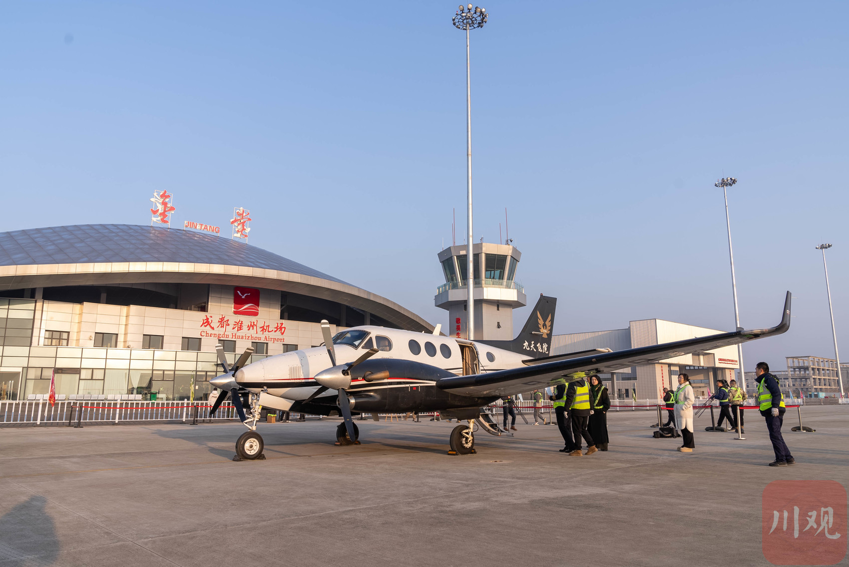 12月15日9时35分,一架载着5名旅客的比奇空中国王C90从成都淮州机场展翅起飞,预计1小时后降落在阆中古城机场,并于今天下午起航返回成都。