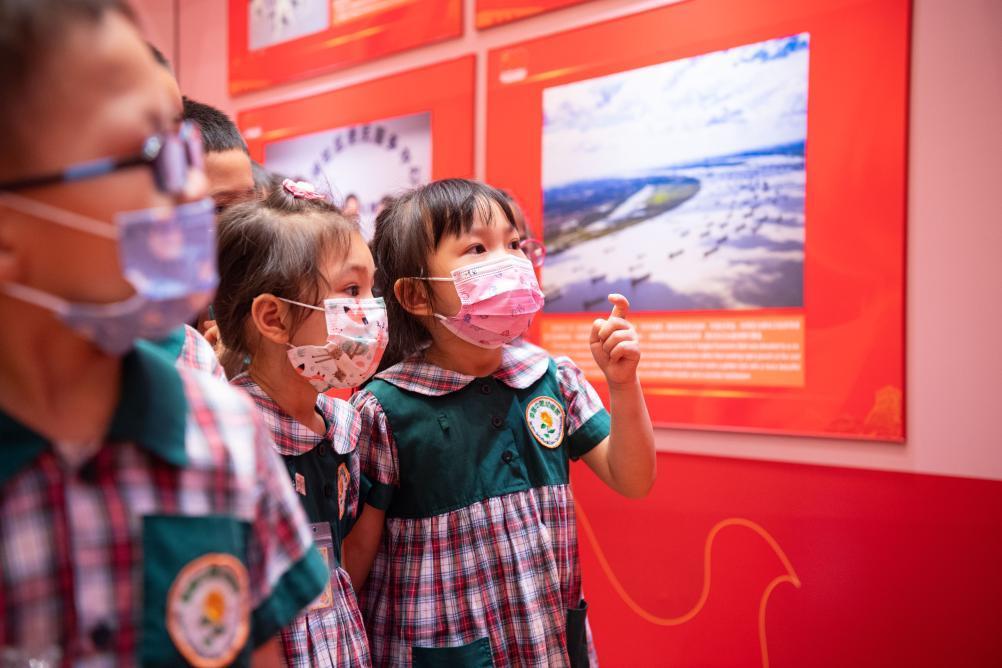 2021年7月12日,小朋友参观在澳门举行的“中国共产党的100年”大型图片展。新华社记者 张金加 摄