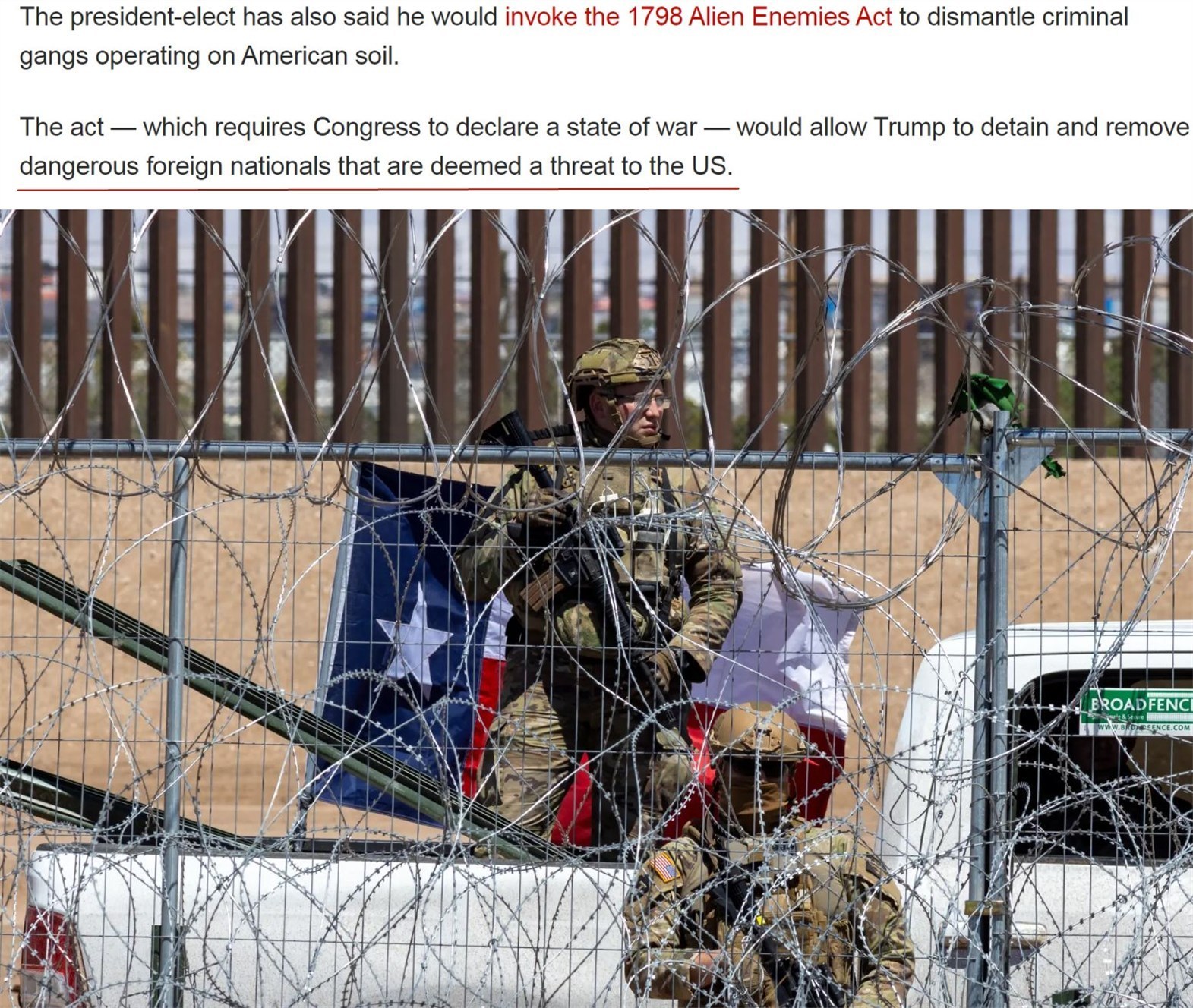 这部法案可以赋予美国总统战时权力,允许联邦政府拘留和驱逐敌国公民。换而言之, 美国总统如果打算依照该法律驱逐非法移民,那么某些非美国公民可能会根据其国籍被宣布为“外国敌人”。