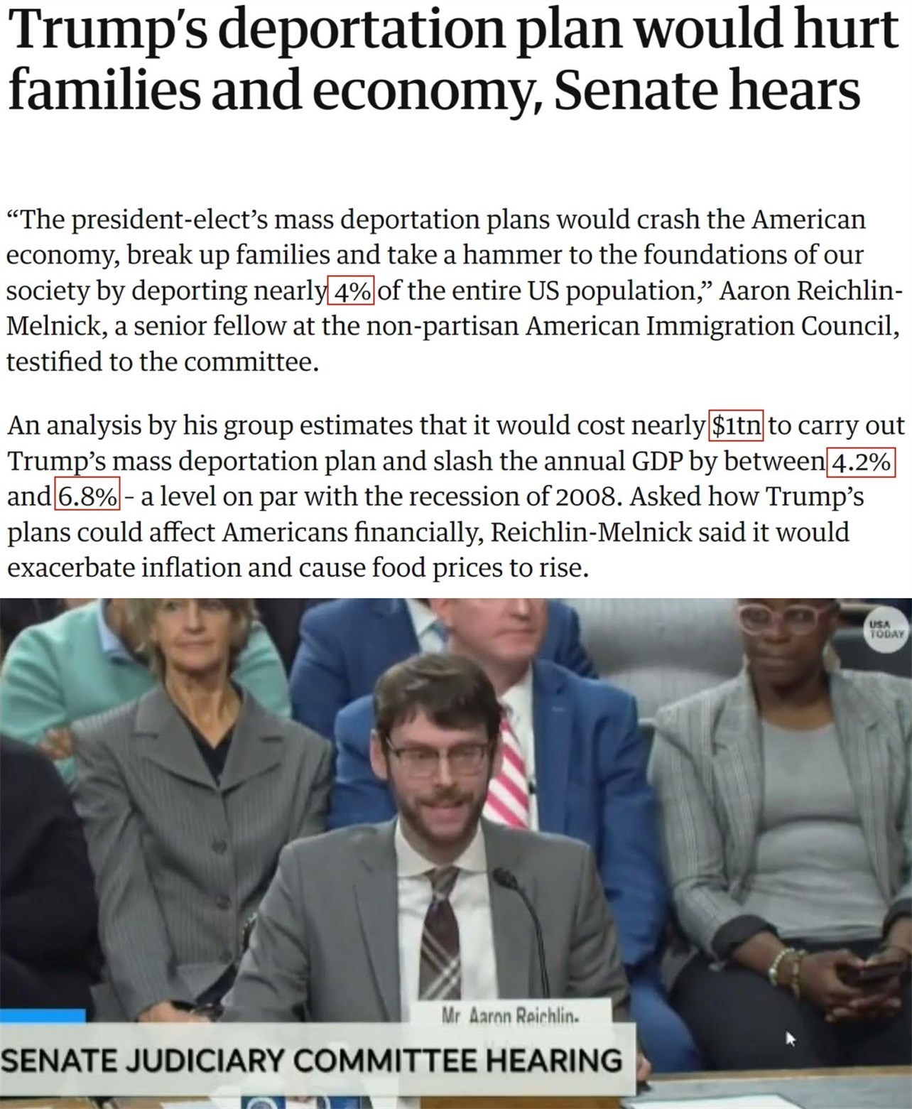 在本月10日美国参议院司法委员会召开的关于特朗普大规模驱逐计划的听证会上,美国移民委员会高级研究员亚伦·赖克林-梅尔尼克表示,特朗普的计划将驱逐近4%的美国人口,从而导致美国经济崩溃、家庭破碎、社会基础遭到重击。