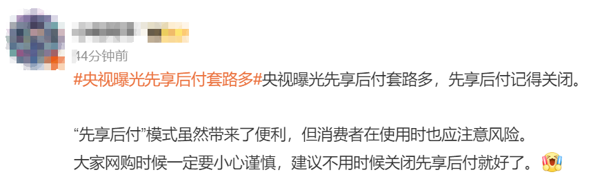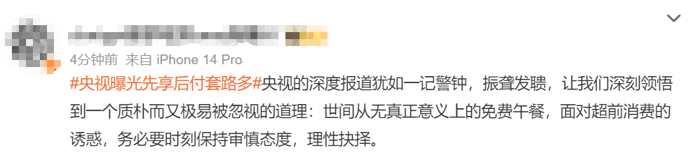 网友表示:世间从无真正意义上的免费午餐,面对超前消费的诱惑,要时刻保持审慎态度,理性抉择。