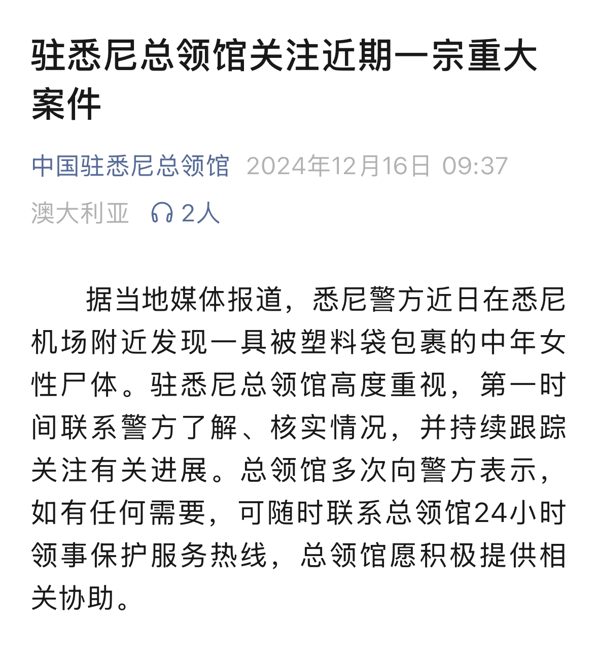 中国驻悉尼总领馆16日发布消息称关注近期一宗重大案件,据当地媒体报道,悉尼警方近日在悉尼机场附近发现一具被塑料袋包裹的中年女性尸体。驻悉尼总领馆高度重视,第一时间联系警方了解、核实情况,并持续跟踪关注有关进展。总领馆多次向警方表示,如有任何需要,可随时联系总领馆24小时领事保护服务热线,总领馆愿积极提供相关协助。