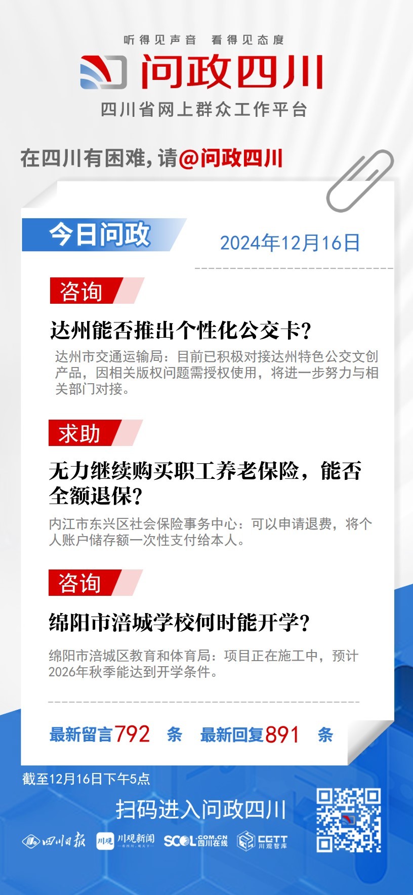 在四川有困难,找问政四川。如果您在四川遇到了操心事、烦心事、揪心事,请登录“四川省网上群众工作平台—问政四川”或拨打问政四川热线(028-96001)留言反映、求助或建议。我们将充分发挥平台的互动联系作用及舆论监督功能,第一时间传递民声,推动问题得以及时解决——听得见声音,看得见态度。