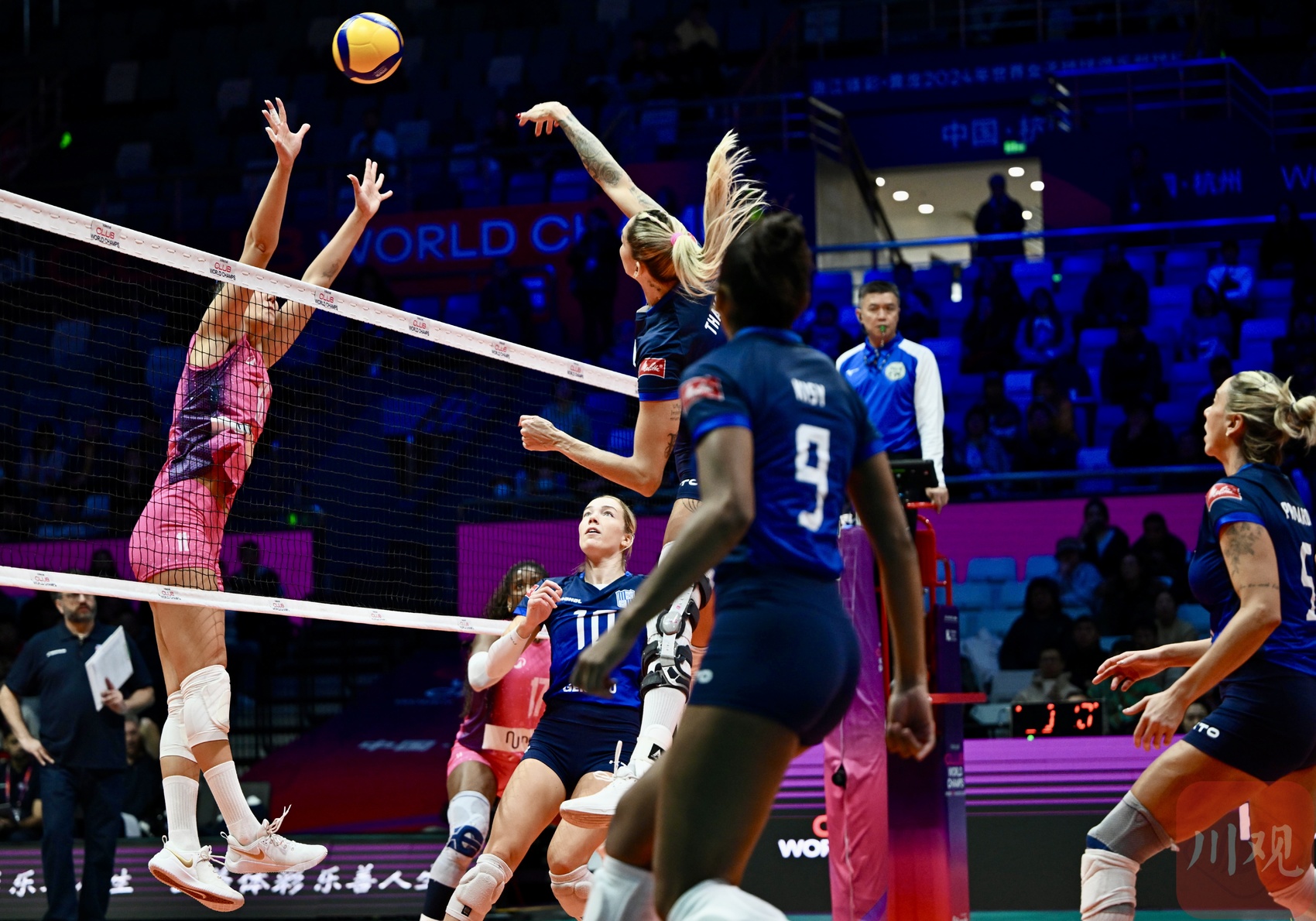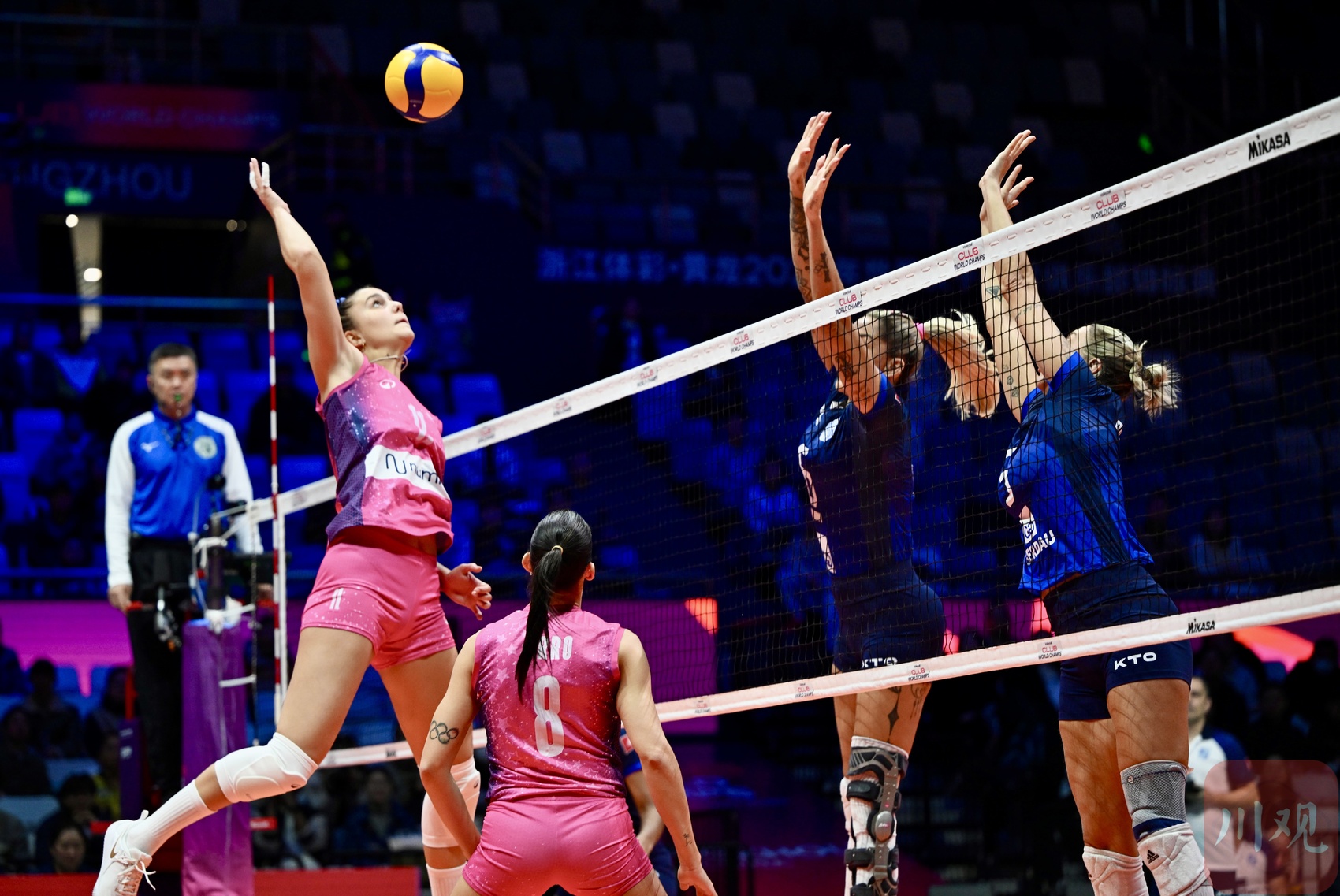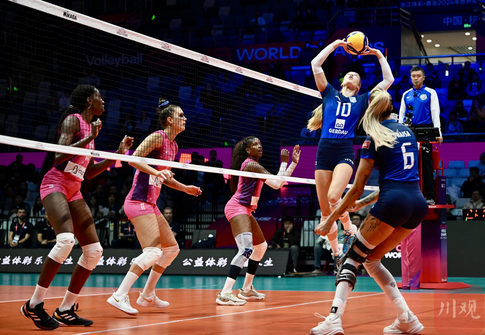 2024年12月17日,2024年世界女子排球俱乐部锦标赛(简称:2024女排世俱杯)揭幕战,在浙江省杭州市黄龙体育中心体育馆举行。意大利米兰女排俱乐部(粉色球衣)3-0(25:17,25:22,27:25)战胜巴西米纳斯女排俱乐部(蓝色球衣),赢得了开门红。