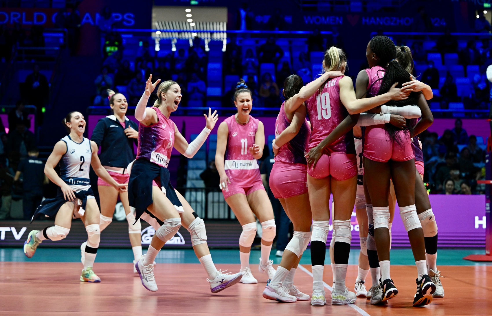 意大利米兰女排俱乐部(粉色球衣)胜利后的庆祝。