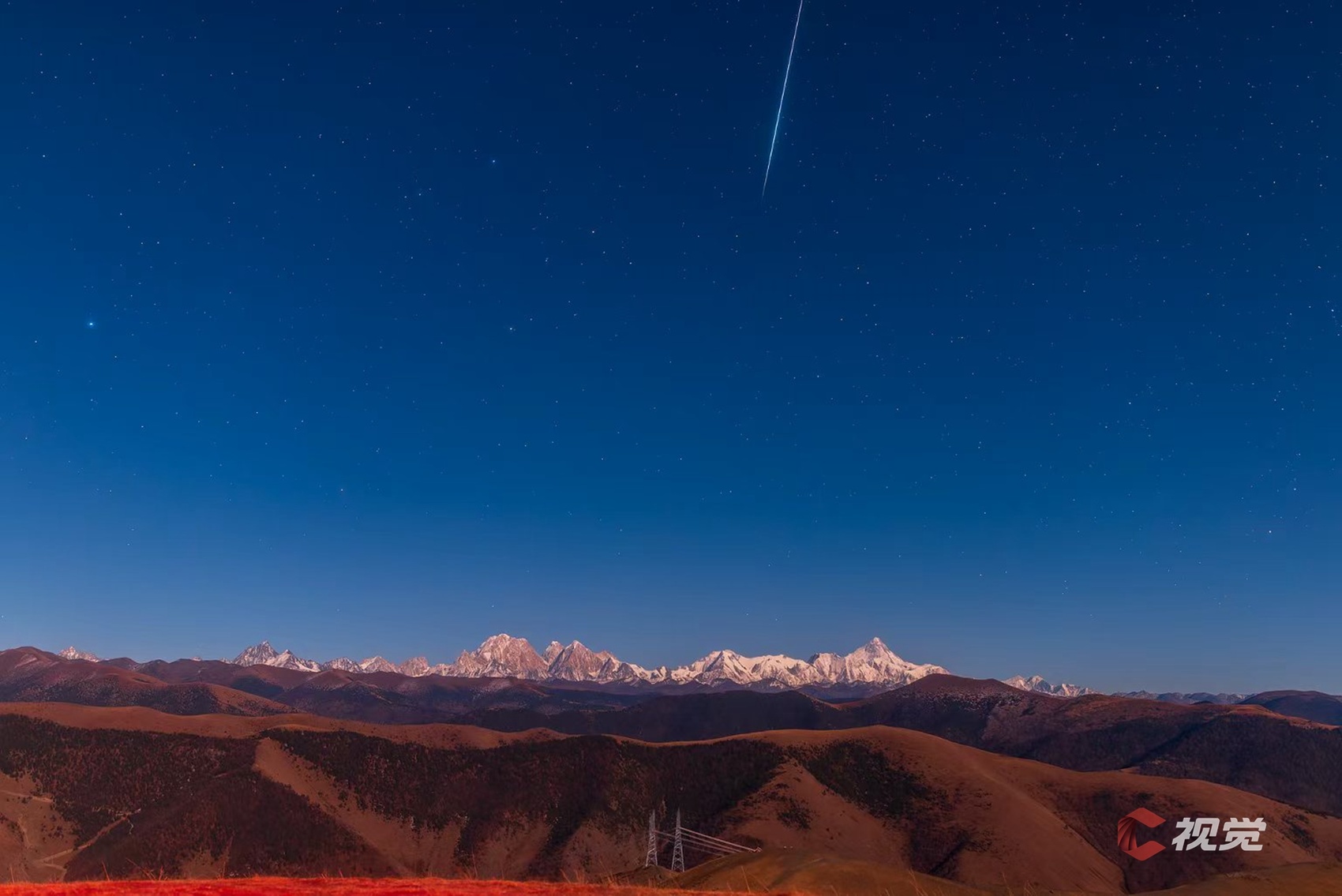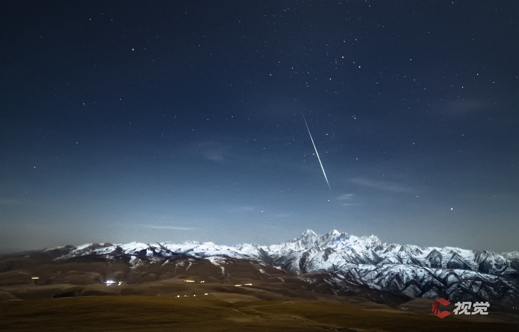 甘孜州康定市甲根坝镇,流星划过夜空,与贡嘎群峰同框。C视觉摄影师 蒋涛