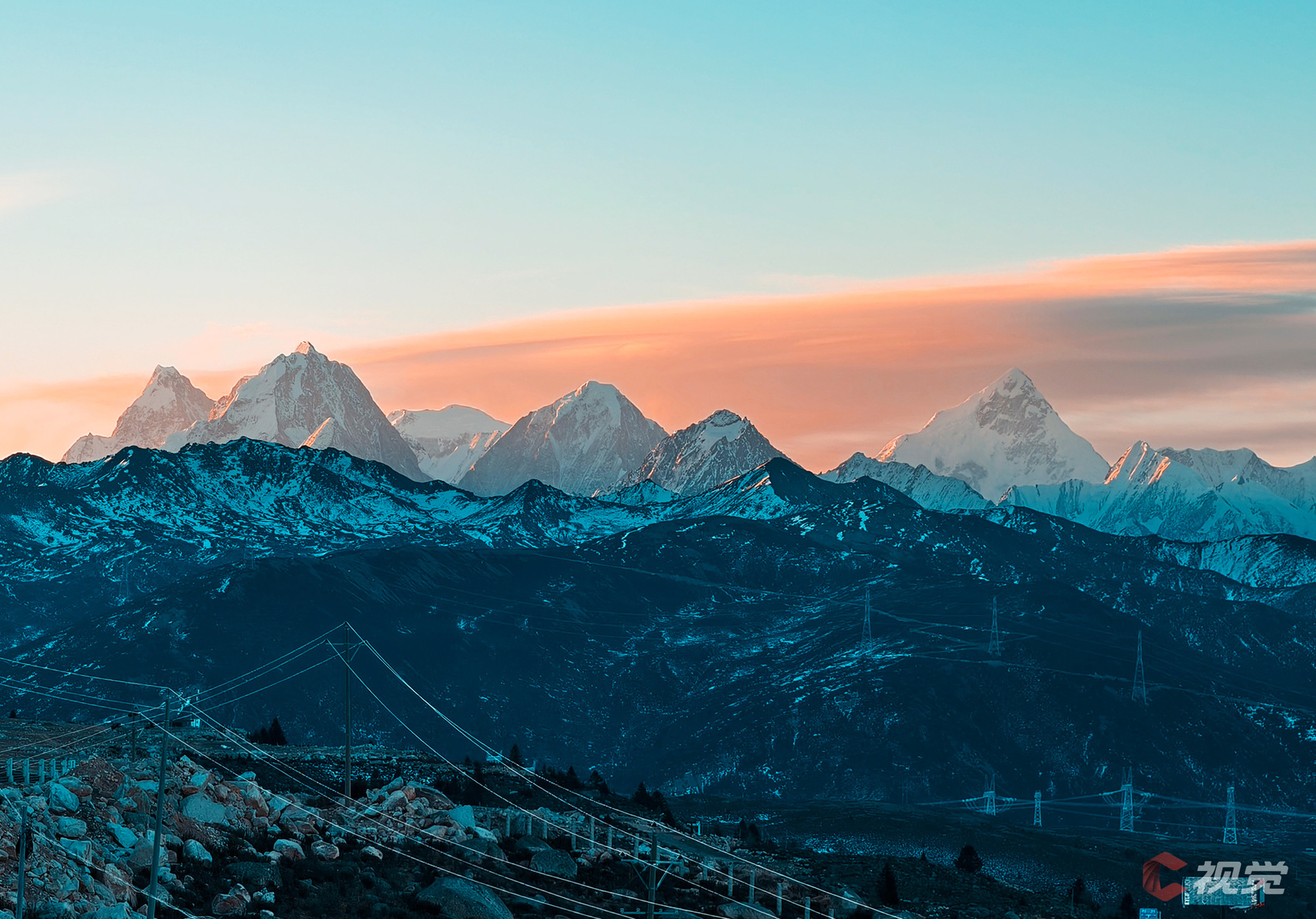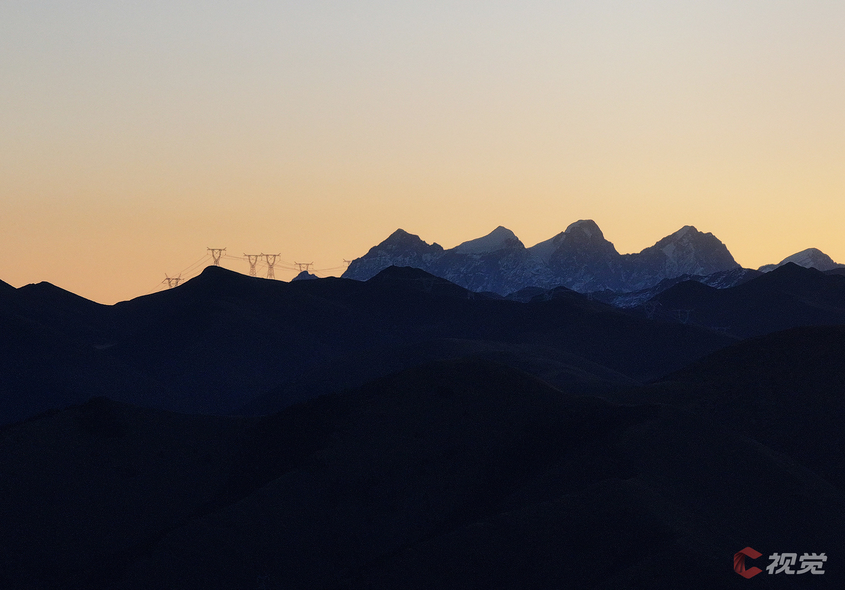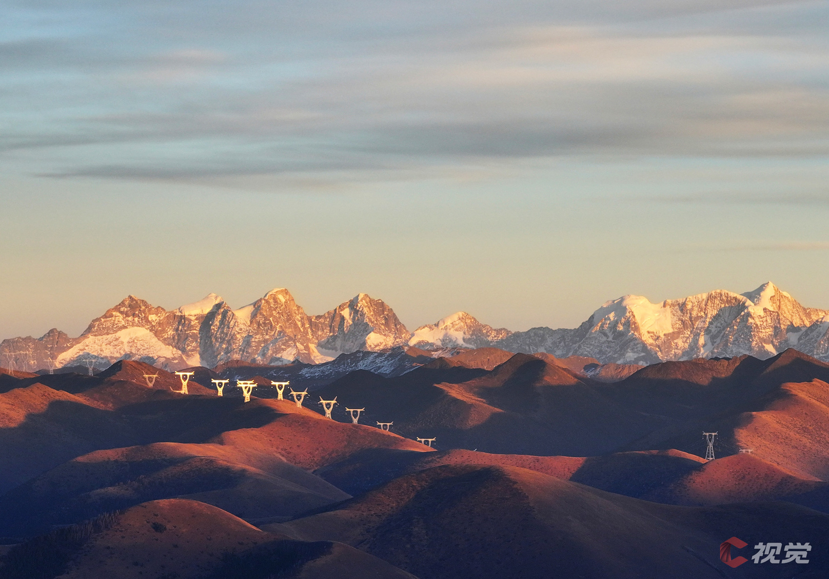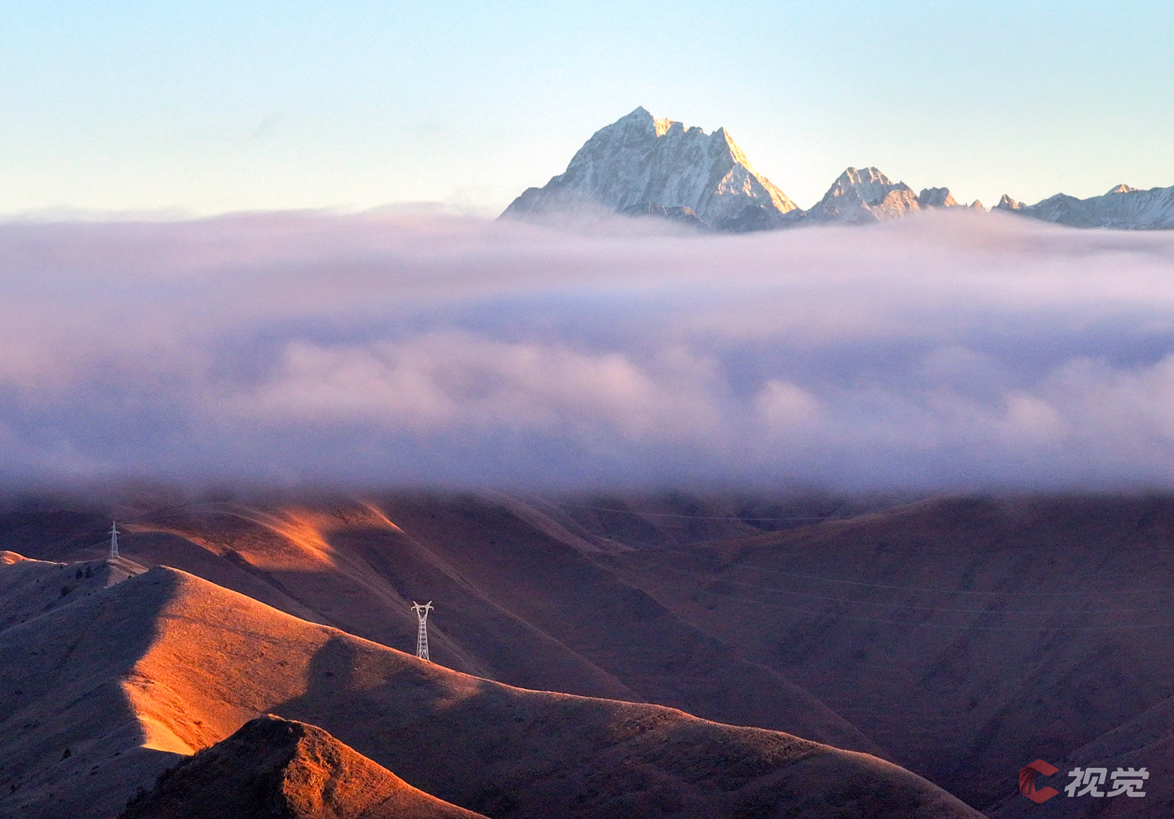 12月16日,日出时刻,折多山上演“日照金山”奇观。川渝1000千伏特高压线路穿越陡峭崎岖的折多山。