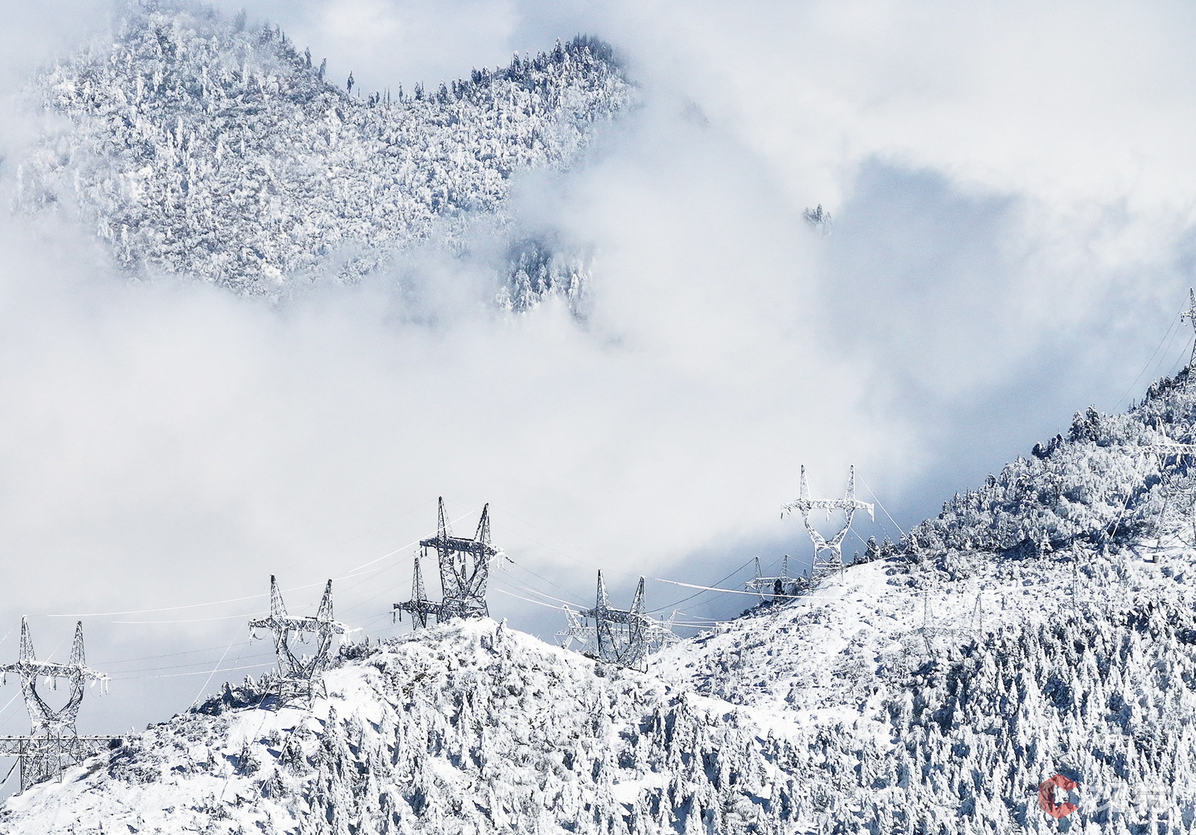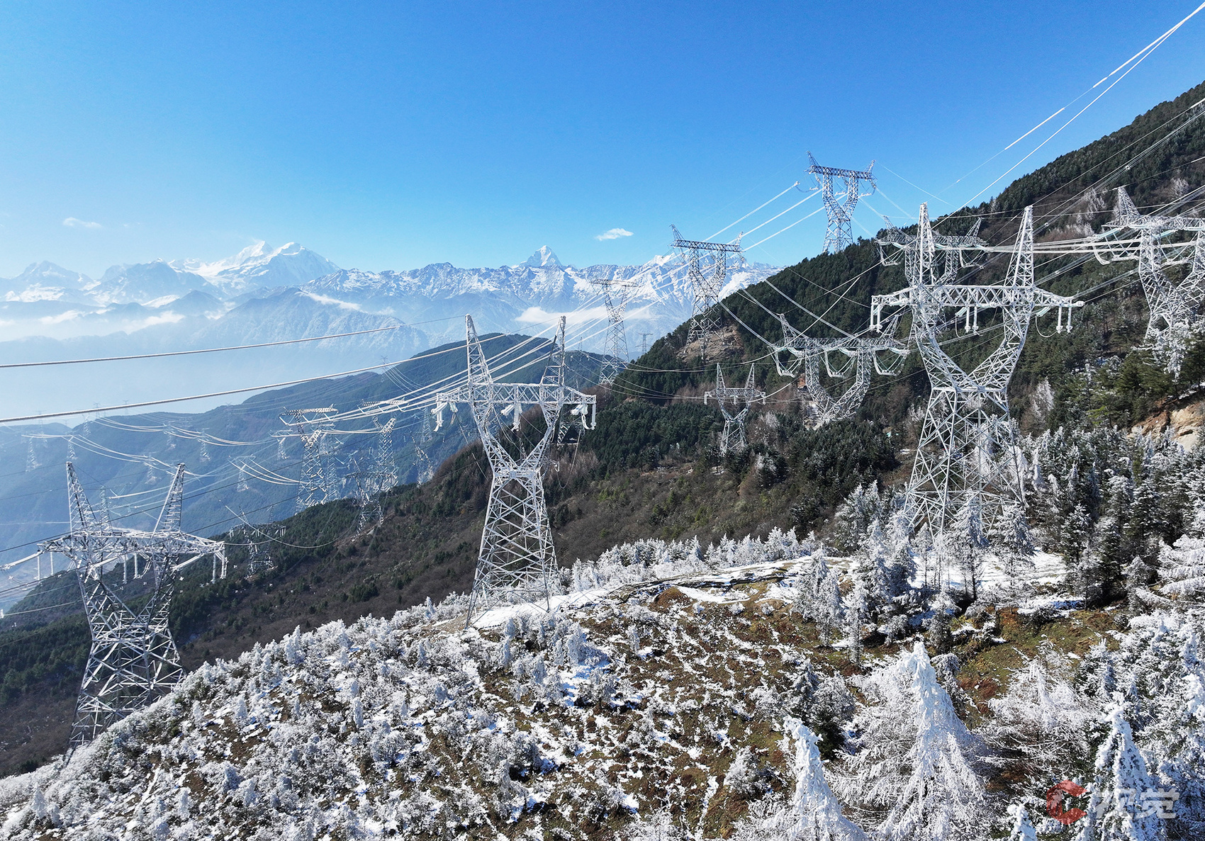 12月15日,川渝1000千伏特高压线路穿越白雪皑皑的二郎山。