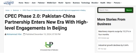 国际在线专稿:巴基斯坦媒体“Urdu Point”12月15日发表评论文章,称赞中巴经济走廊(CPEC)建设已取得显著成果,“升级版”新阶段将迎来更多发展机遇。文章认为,CPEC作为中巴共建“一带一路”旗舰项目,意义重大,将造福整个南亚地区,成为国际合作新典范。