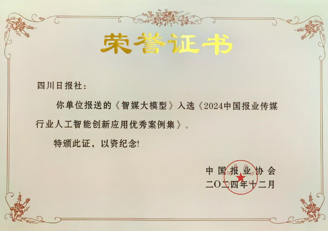 12月19日,2024中国报业传媒行业人工智能应用大会在上海开幕。四川日报推出的《智媒大模型》获中国报业传媒行业人工智能创新应用优秀案例。此前,在2024中国报业技术年会上,《智媒大模型》还获得全国媒体融合技术应用案例一等奖。