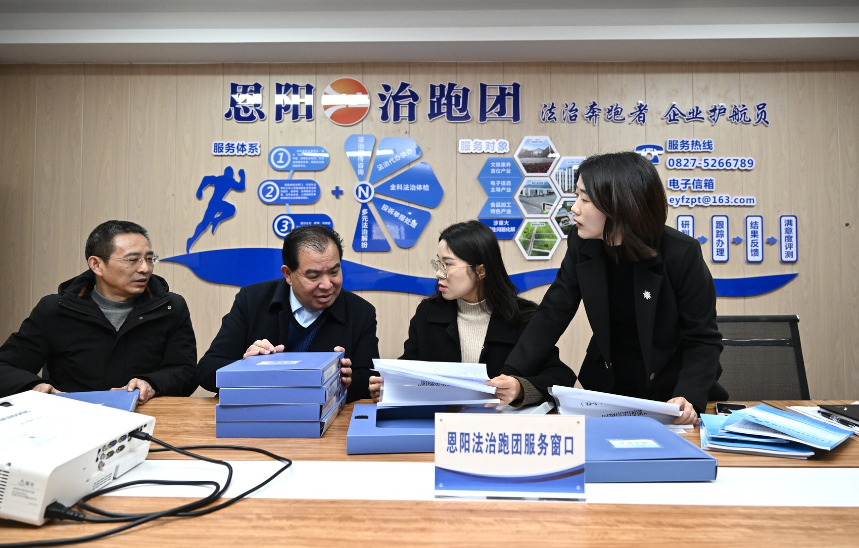 12月11日,恩阳小微企业创业园内,巴中市恩阳区委政法委、区人社局和社会法律服务队4名“法治跑手”正点对点上门,对园区企业营业执照、用工合同等方面的风险进行“法治体检”。