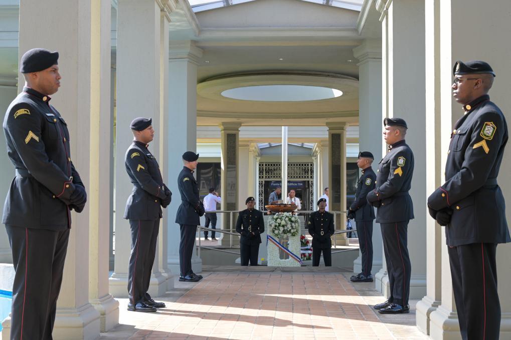 1月9日,在巴拿马首都巴拿马城,士兵们守卫纪念“护旗运动”的“永恒之火”纪念碑。新华社记者陈昊佺摄