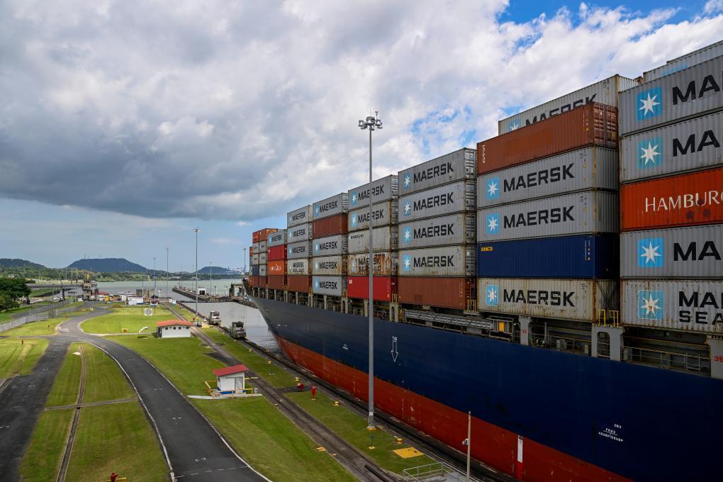 在巴拿马运河的米拉弗洛雷斯船闸旁,来自世界各地的游客聚集在观景台上。随着闸内水位渐渐降至海平面高度,一艘巨型集装箱货轮在两侧轨道牵引机拉动下缓缓通过船闸,驶向浩瀚的太平洋。