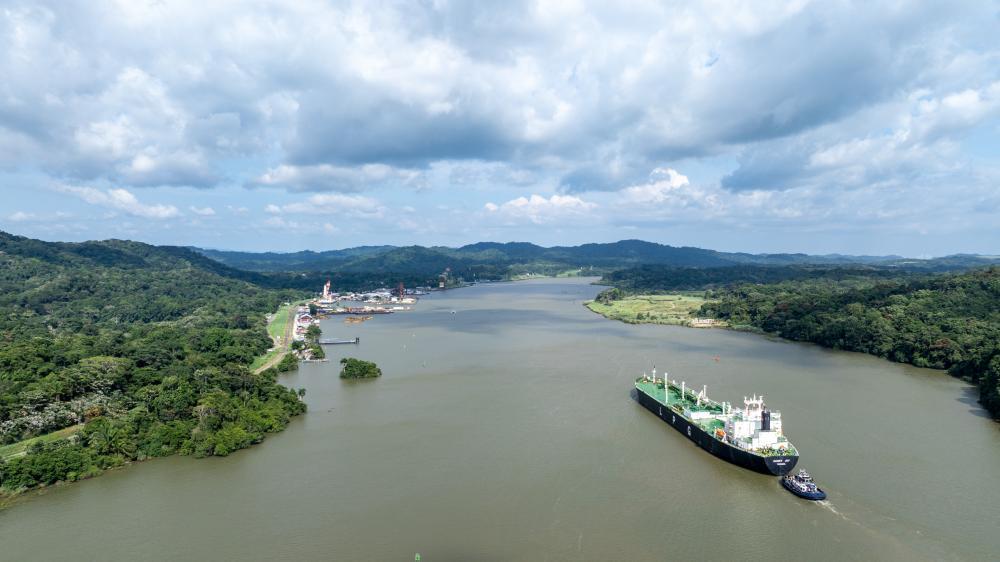 8月28日,在巴拿马首都巴拿马城附近,一艘货轮在巴拿马运河上航行(无人机照片)。新华社记者李木子摄