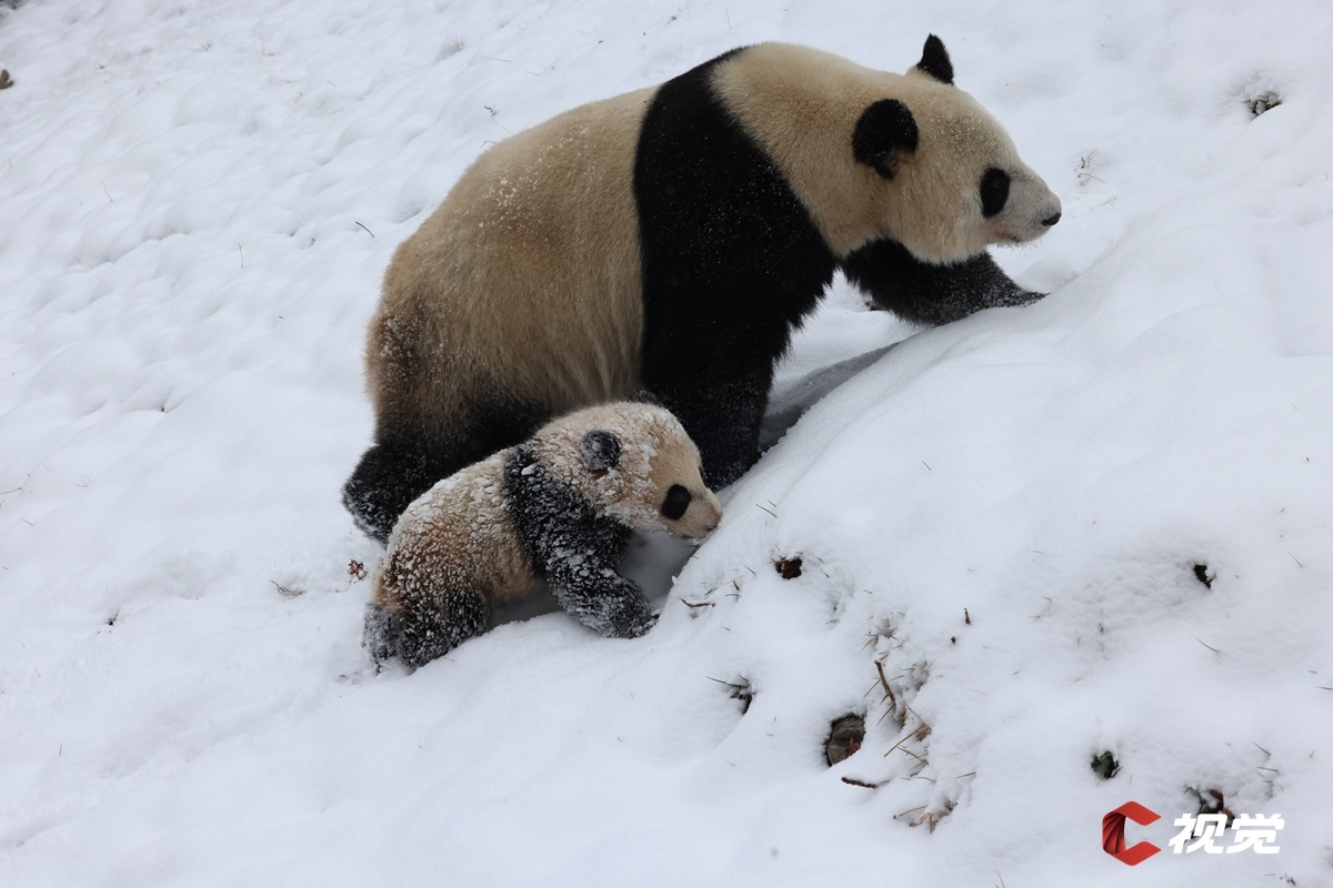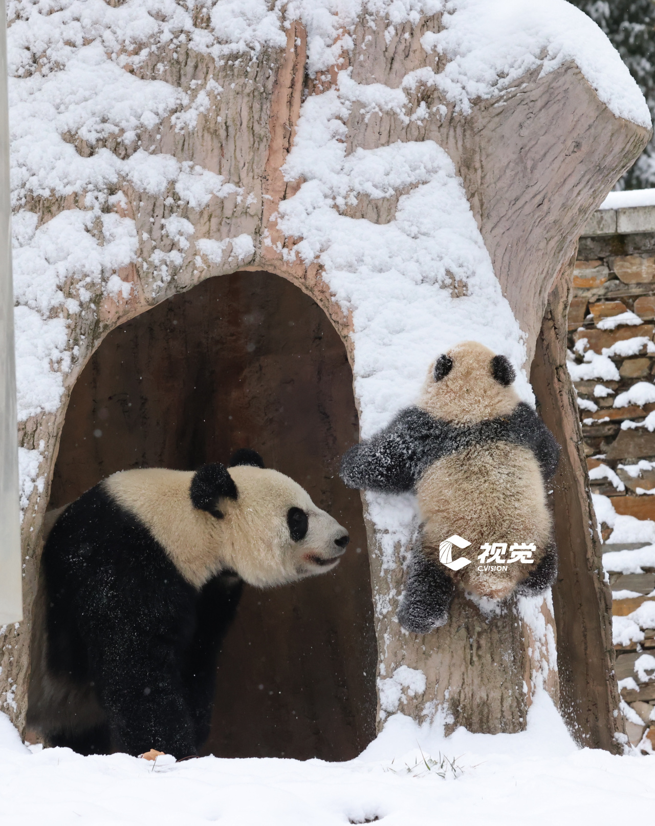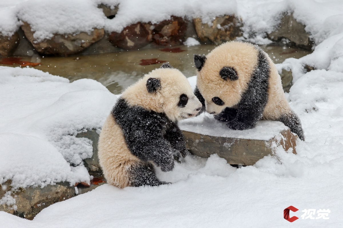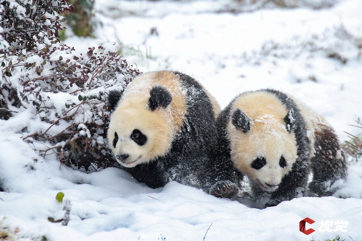 阿坝州汶川县耿达镇中国大熊猫保护研究中心,两只大熊猫在雪中嬉戏。 C视觉摄影师 肖飚