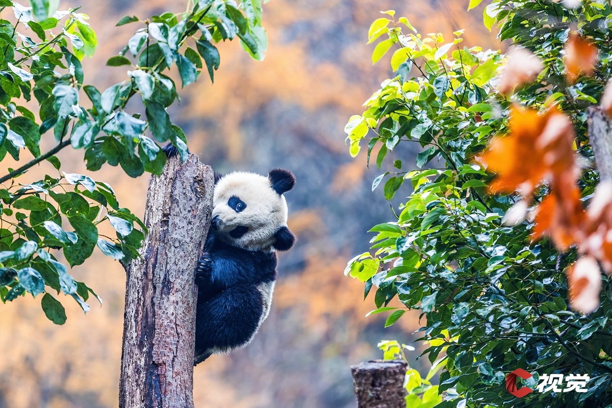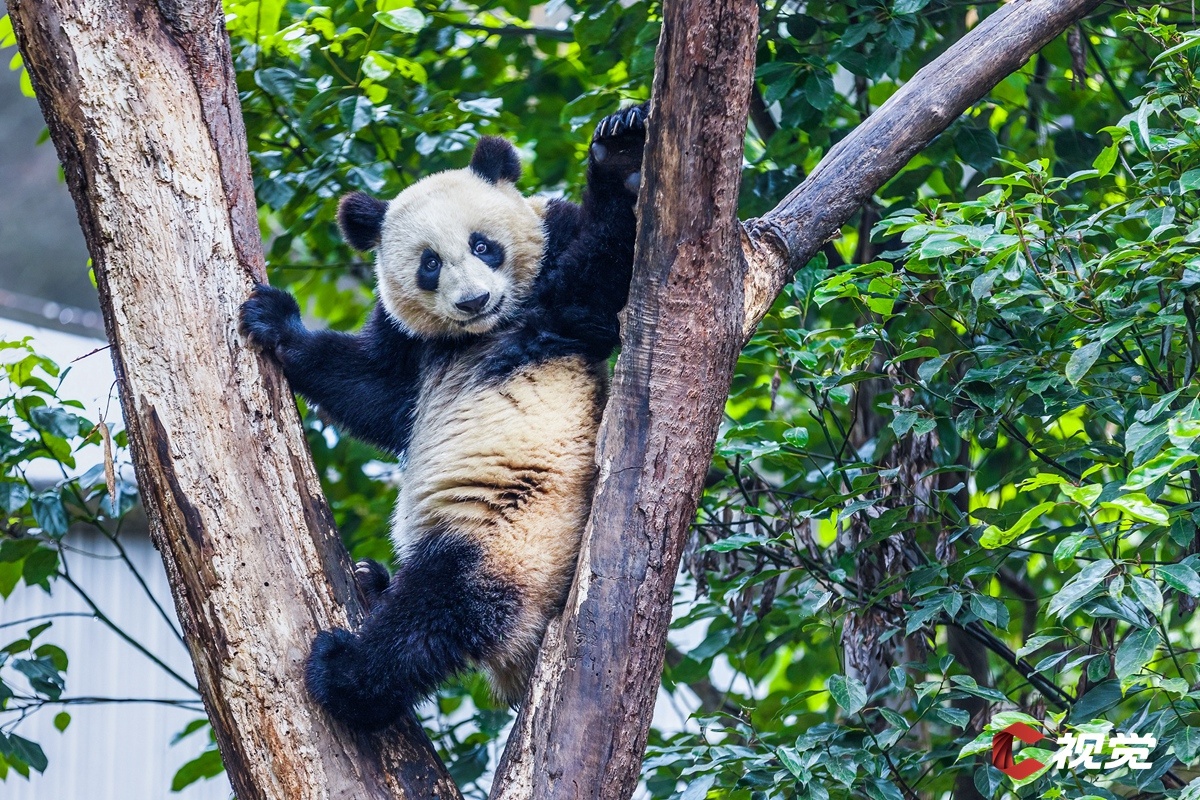 卧龙神树坪基地的大熊猫树上嬉戏,萌态吸引游客拍照。 C视觉摄影师 林漫