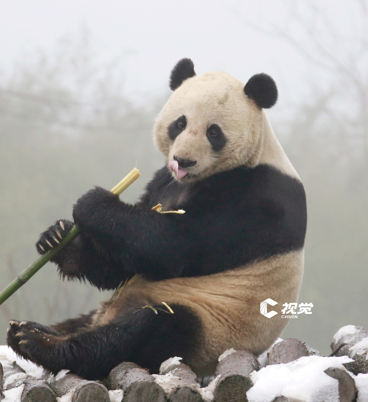 大熊猫“云涛”正萌态十足地在铺着瑞雪的支架上食用竹子。 C视觉摄影师 邱海鹰