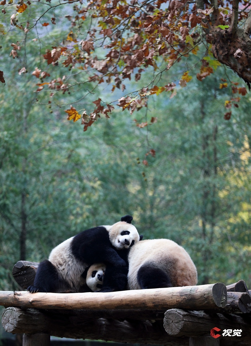 在寒冷的冬日,两只大熊猫相互依偎,享受着属于它们的宁静时光。 C视觉摄影师 王金城