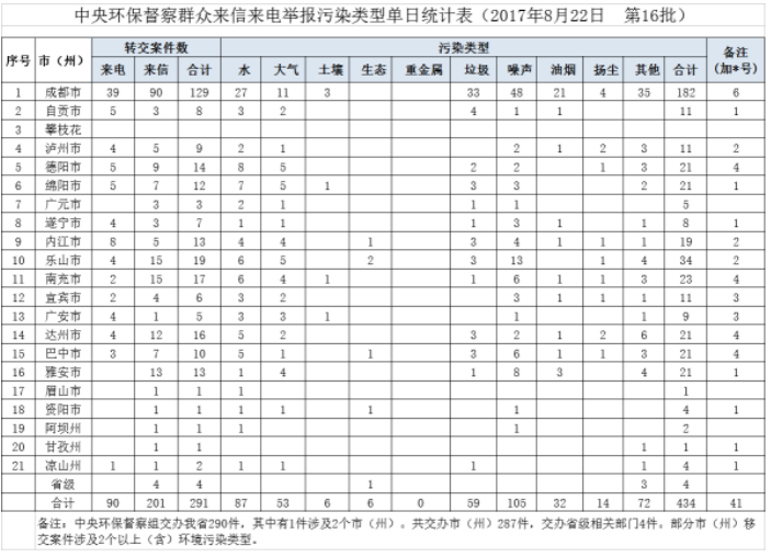 在中央环保督察组向我省累计移交的3190件信访件中,成都市共1691件,信访件较多的其他市分别为绵阳市141件、 德阳市132件、乐山市125件、南充市117件、达州市110件、眉山市110件。从污染类型看,3190件群众来电来信信 访件共反映4806个环境问题,投诉较多的依次为噪声污染1055个、水污染983个、大气污染683个、垃圾污染672个 、油烟污染365个。