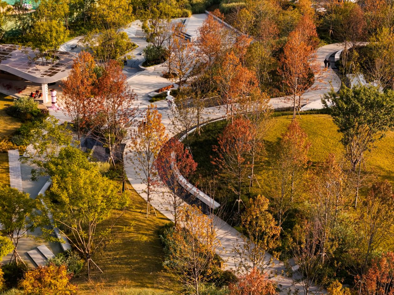 在自然造景方面,上璟公园独具匠心,集合不同季节特色植物打造春分花境、夏日河谷、金色秋林、梅园冬景四季物候。并将水岸景观、科普文化、自然特色凝练,为漫步其中的人们呈现具有标签感的十二大公园场景。
