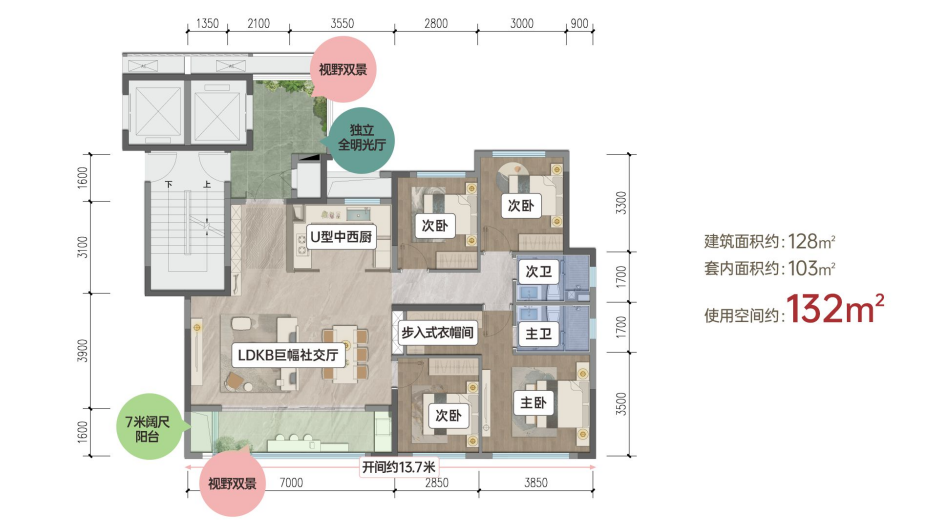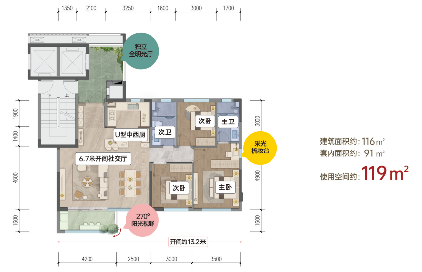 约13.2米开间的尺度之下,次卧开间也能达到3米,实现动静分区空间平权。