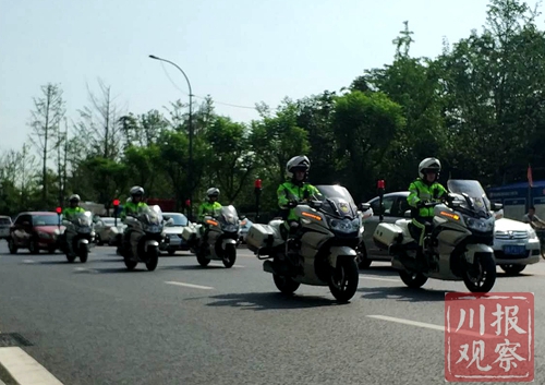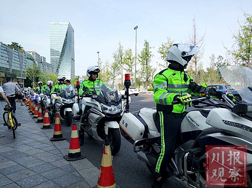绿黑相间制服、黑色手套、白色头盔、蓝白色摩托车……8月23日上午9点过,在成都新会展中心北门外,由10名成都市交管局各分局骨干力量组成的成都交警铁骑队首次亮相。据成都市交管局相关负责人介绍,成都交警铁骑队是适应动态化、信息化条件下道路交通管理工作的发展需要,更是成都“科学治堵”的需要。