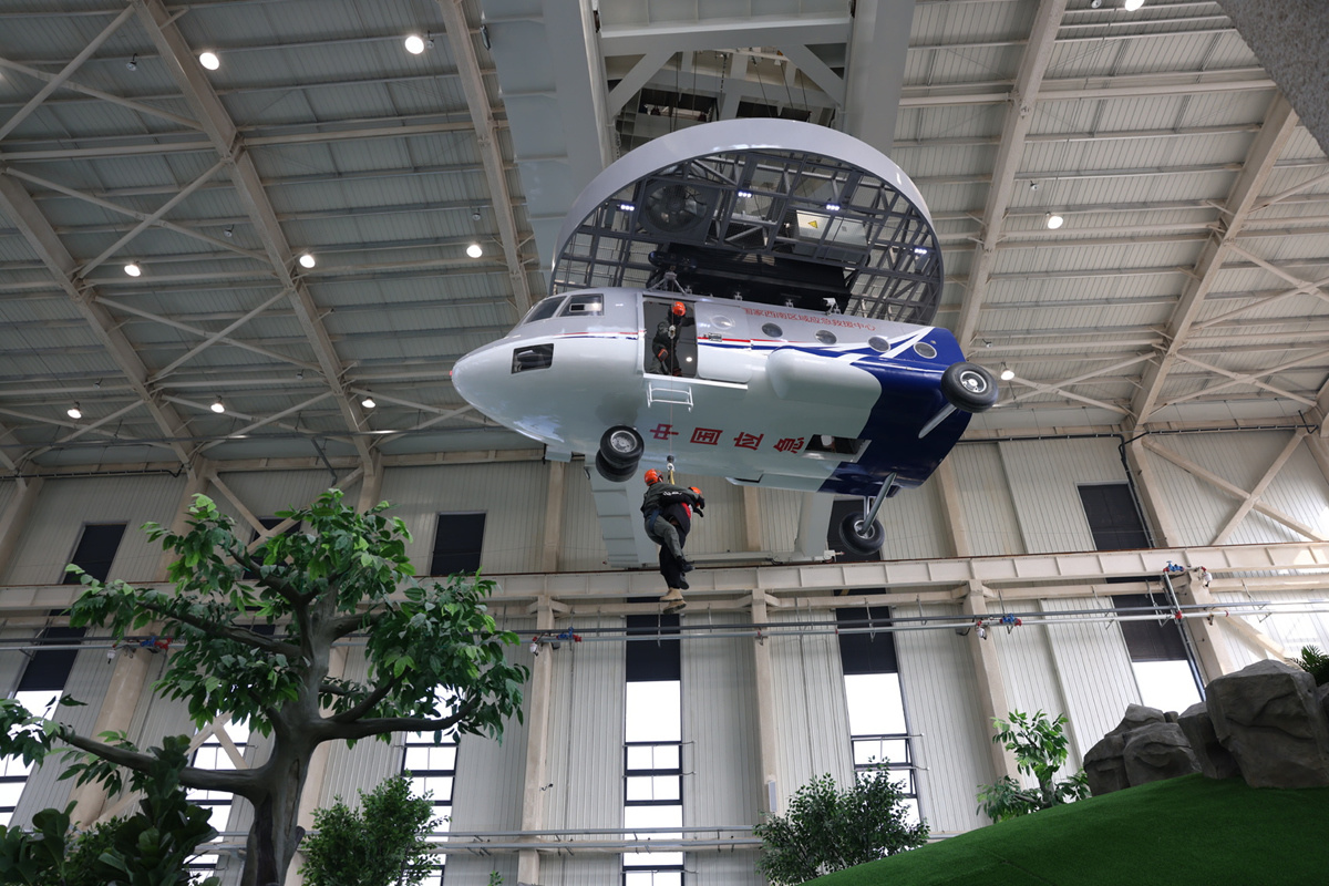 救援人员在航空模拟训练馆进行训练