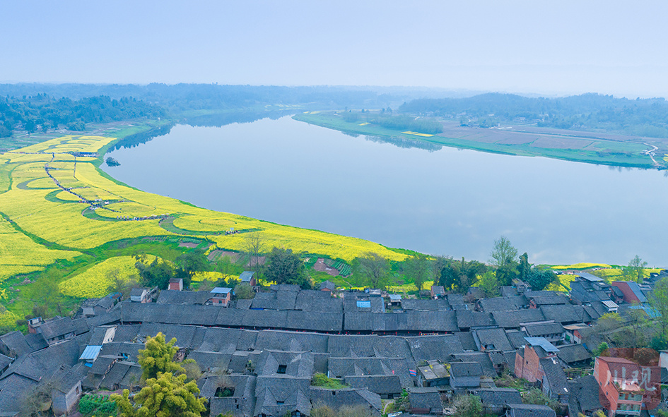 渠江流经肖溪古镇形成的江湾处,连片油菜花盛开,与碧绿江水、韵味古镇相映成景,美不胜收。
