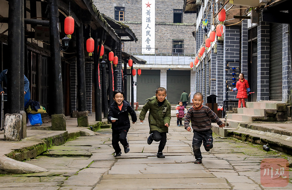 广安肖溪古镇,孩童在青石板路和古朴巷弄间欢笑奔跑,给静谧古镇增添活力。