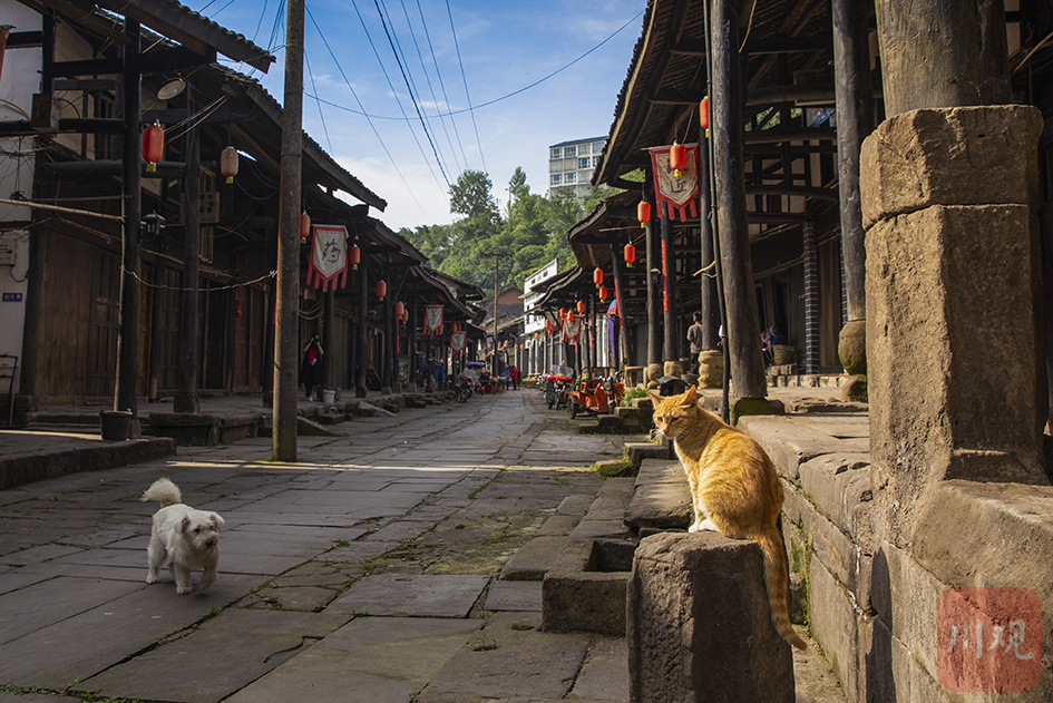 阳光洒在广安市广安区肖溪老街,猫狗悠然晒着太阳,呈现出一副宁静的生活画面。