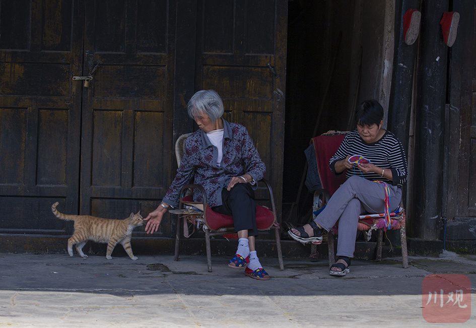 广安肖溪古镇里,一位老人正悠然逗弄猫咪,画面宁静而温馨。