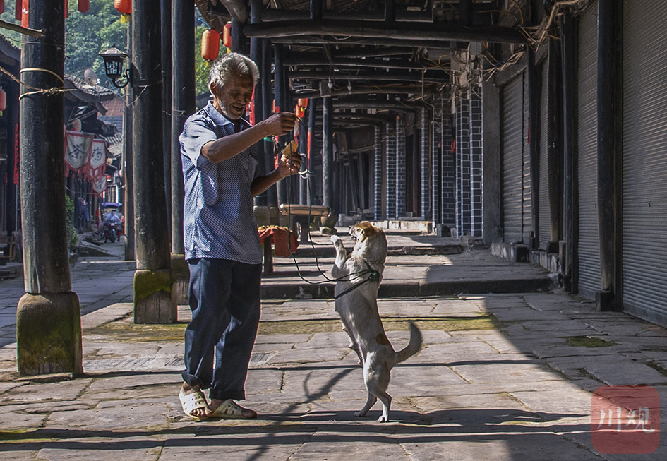 广安肖溪古镇里,一位老人正和小狗嬉戏玩耍。