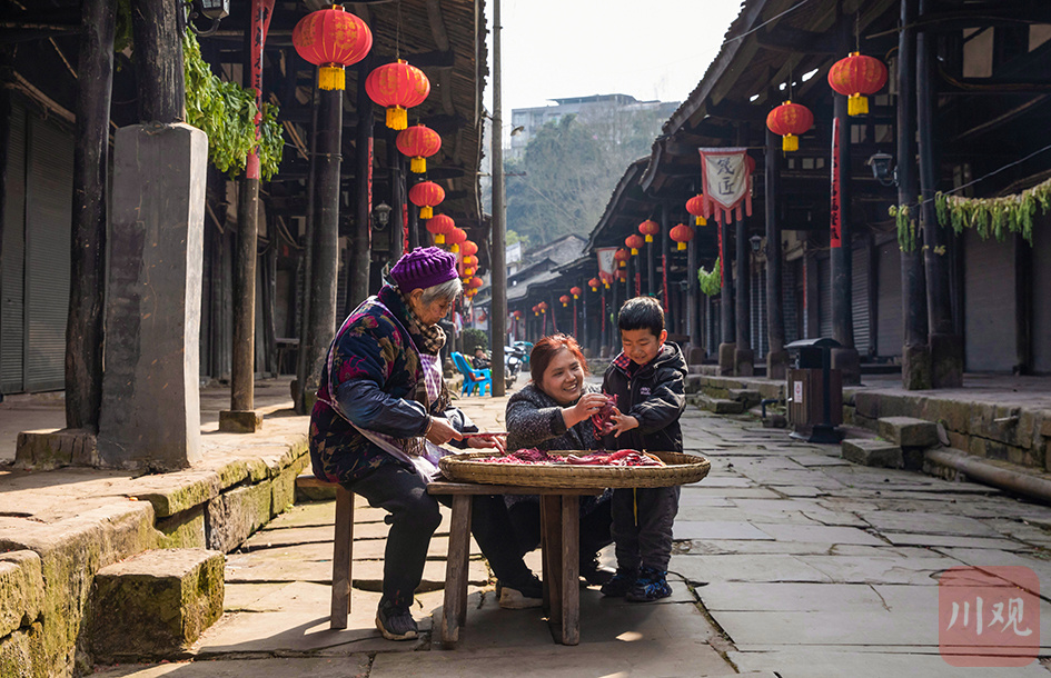 在广安肖溪古镇,大人带着小朋友观看胭脂萝卜干制作,一同感受古镇传统手艺魅力。