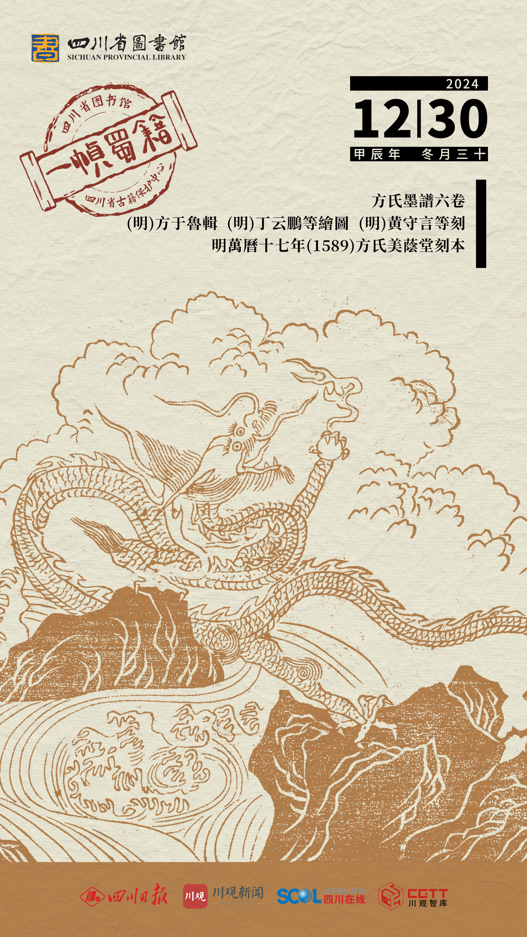 12月30日,一帧蜀籍邀您欣赏《方氏墨谱》。海报所选用图为《方氏墨谱》六卷,由(明)方于鲁辑,(明)丁云鹏等绘图 ,(明)黄守言等刻,明万历十七年(1589)方氏美荫堂刻本。