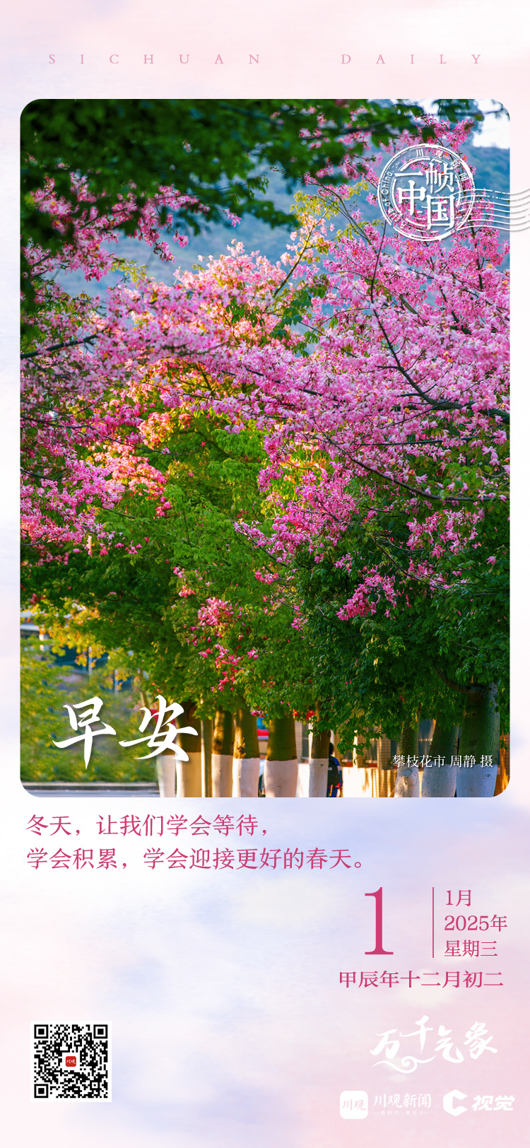 今天是2025年的第一天,川观新闻《一帧中国》与你一起来到攀枝花市,共享暖阳繁花,祝你在新的一年里人生如花,绚丽多彩。