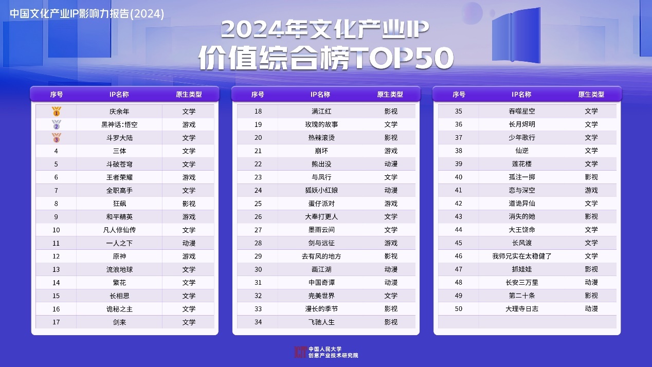 《报告》设置了IP价值综合指数,选取2023年1月至2024年9月有过小说、动漫、影视、游戏、实体线下衍生等形态的创作或改编,新发布或仍提供更新、下载等服务的前100名中国当代IP,从IP感知力、传播力、开发力、拓展力四个维度构建综合评价体系,最终公布了前50大IP构成“2024年文化产业IP价值综合榜TOP50”(以下简称“TOP50 IP”),四川网络作家天蚕土豆代表作《斗破苍穹》与《庆余年》《黑神话:悟空》《斗罗大陆》《三体》,位列前五。