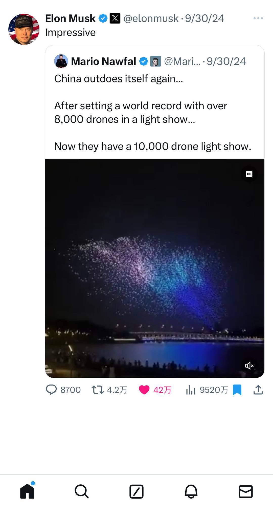 埃隆·马斯克在推特上为大漠大在深圳湾完成的一场表演点赞。该表演创造了新的吉尼斯世界纪录——“单台电脑控制最多无人机同时升空”、“最多无人机组成的空中图案”。