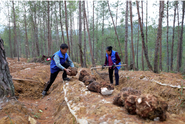 广元市昭化区元坝镇中梁村的昭化茯苓现代林业园区里,村民正在采收茯苓。广元观察 高志农 摄