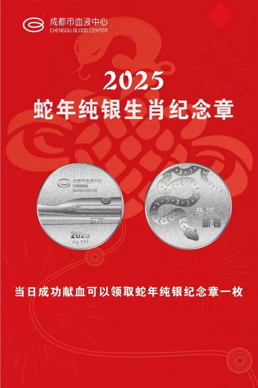 12月31日,记者从成都市血液中心获悉,2025年1月1日起,在成都市各献血点献血的市民,可领取到999纯银的2025年蛇年新春献血者限量版银质纪念章。